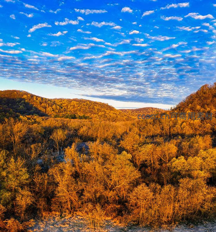 晨曦洒落山谷,金黄树叶与蓝天白云交相辉映,层叠山峦间雾气缭绕,展现大自然壮丽的秋季画卷。