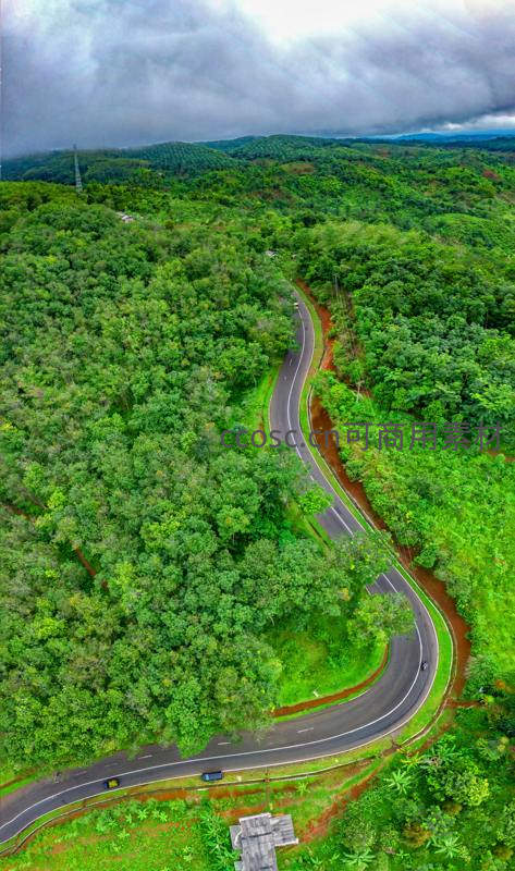 蜿蜒公路如蛇行于浓密热带雨林中,乌云压顶预示风雨将至,绿意蓬勃与人工道路形成强烈视觉对比。