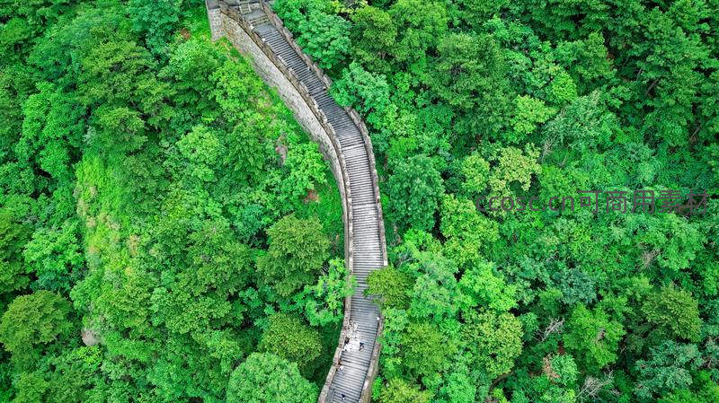 从高空俯瞰,一条古老的石阶小径在浓密的绿色森林中曲折延伸,宛如一条沉睡的巨龙,静谧而充满生机。