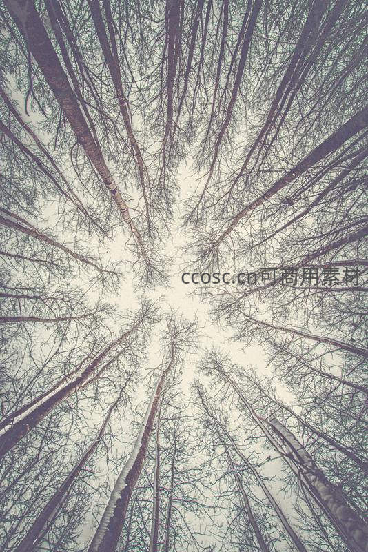镜头朝天,高耸的树干与交错的枝桠构成天然画框,将淡雅的天空温柔框住,展现森林垂直空间的壮美与诗意。