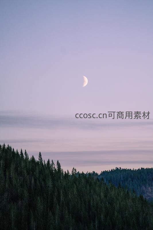 一弯新月悄然悬于苍穹,下方是连绵起伏的墨色林海,天边晚霞渐褪,整个画面弥漫着静谧而浪漫的黄昏气息。
