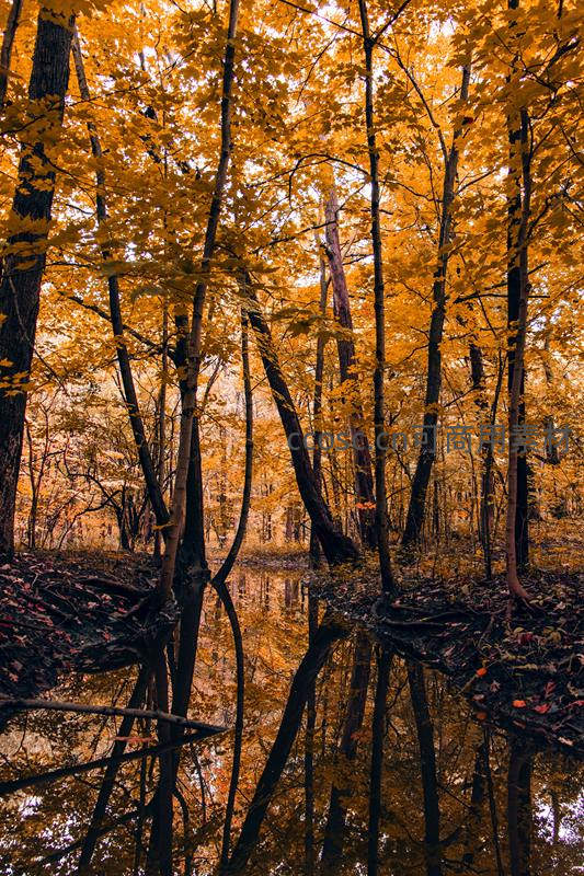 阳光透过满目金黄的枫叶洒向林间静水,树木与倒影交相辉映,落叶铺满湿地,营造出温暖而诗意的秋日森林氛围,令人心旷神怡。