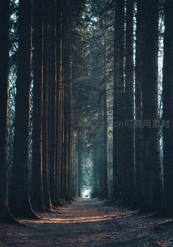 高耸笔直的松树夹道形成天然隧道,晨雾弥漫中一束暖光洒在远处的小鹿身上,营造出梦幻而静谧的森林秘境,充满诗意与生命力。