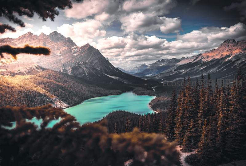 碧绿湖水镶嵌在雄伟山脉怀抱中,白云翻涌,松林覆盖山坡,构成一幅气势磅礴、宛如仙境的绝美山水画卷。