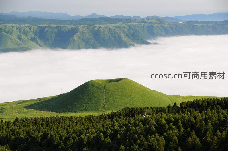 连绵起伏的绿色山丘高耸于浩瀚云海之上,近处深绿森林与远处淡青山脉层次分明,宛如仙境,展现了大地的雄浑与生命的蓬勃。
