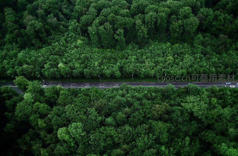 一条笔直的公路如丝带般穿梭于浓密的绿色森林之中,车辆行驶其上,形成人与自然和谐共存的独特景象。