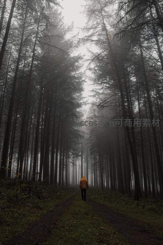 一人身着橙衣,独自走在被浓雾包裹的森林小径上,高耸的树木如沉默守卫,衬托出人与自然的渺小与敬畏。