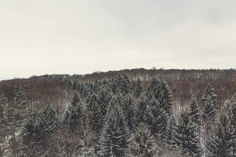 灰白天空下,雪覆针叶林层叠延展,枝头积雪轻盈,整片森林沉静而肃穆,透出冬日独有的苍茫与安宁。