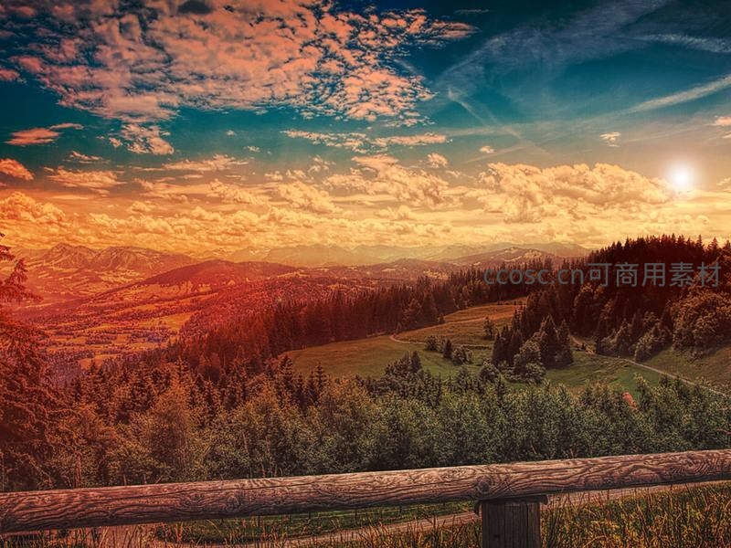 夕阳西下,天空被染成金红与深蓝交织的绚烂画卷,远山连绵起伏,近处木栏杆前是开阔的山谷与森林,尽显大自然的恢弘与温柔。