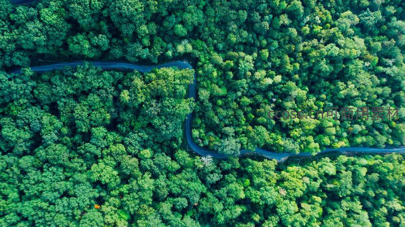 从高空视角看,一条深色公路如游蛇般穿梭于无边无际的绿色森林之中,道路两旁树木密集,层次分明,展现出自然生态的壮阔与秩序。
