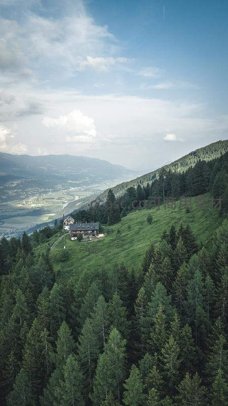 一座传统木屋静卧于青翠山坡之上,俯瞰下方开阔的河谷与田野,四周环绕着茂密的针叶林,远处山峦叠嶂,天空澄澈,意境悠然。