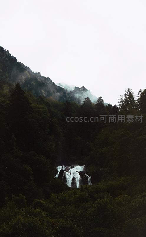 一道洁白的瀑布从幽暗的山谷中奔腾而下,四周被浓密的森林和飘渺的云雾环绕,尽显大自然的磅礴与静谧。