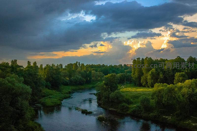 蜿蜒的河流在茂密森林中静静流淌,天空云层被夕阳染成金橙色,光影交错间营造出静谧而壮丽的自然画卷。