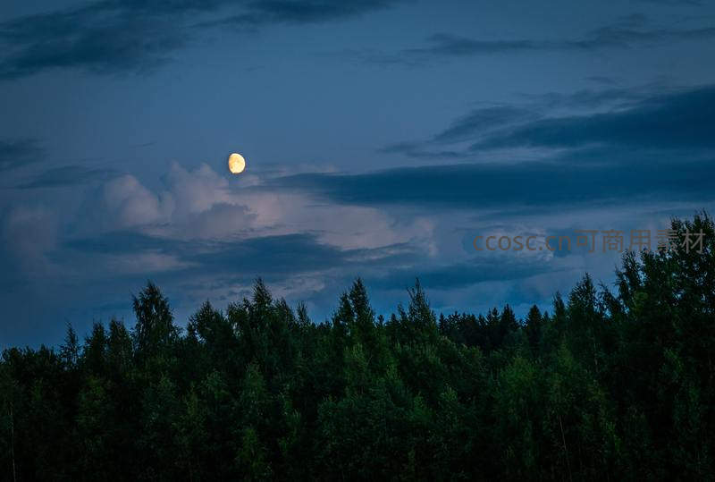 一轮明月静静悬于深蓝色夜幕之上,云层缓缓飘动,下方是沉默的森林剪影,整个画面弥漫着神秘、安宁与诗意的夜晚氛围。