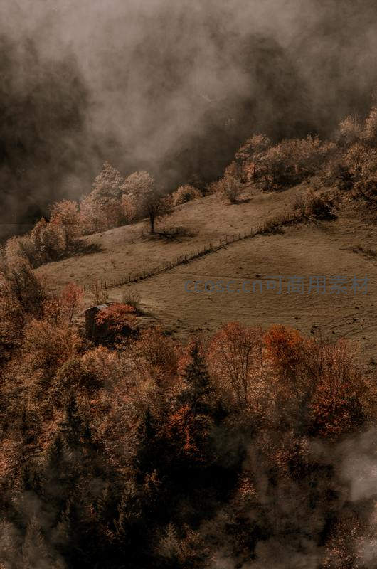 暖色调的秋日山坡被轻柔雾气环绕,枯黄树叶点缀其间,一座小屋静卧草坡之上,尽显田园诗意与寂寥之美。