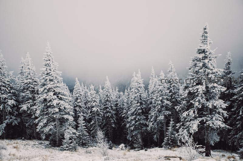 皑皑白雪覆盖整片针叶林,枝头挂霜,天地一色,营造出空灵寂静、纯净无瑕的冬日仙境。