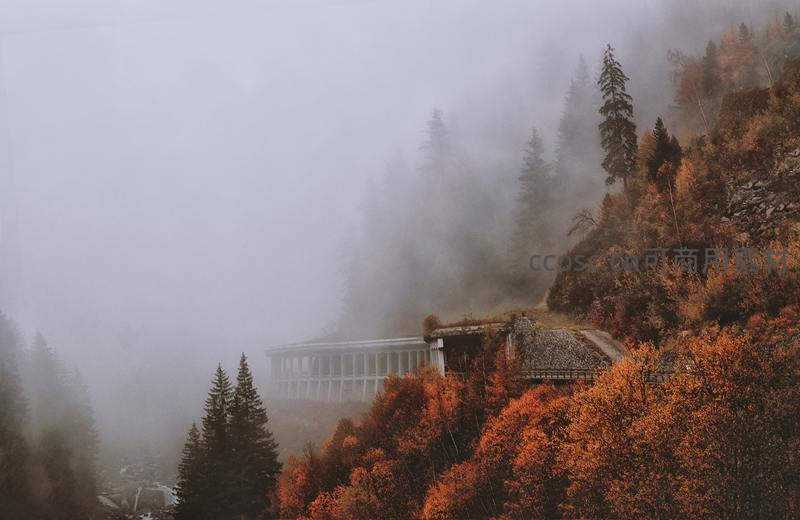 一座白色建筑半隐于浓雾与绚烂秋林之间,宛如童话中的古堡,散发出神秘而宁静的历史气息。