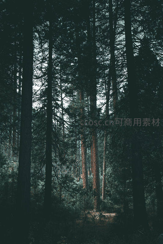 茂密的针叶林中,笔直高耸的树干刺破阴霾的天空,林间光线昏暗,弥漫着神秘而静谧的气息,仿佛进入一个远离尘世的原始世界。