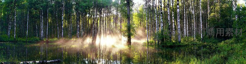 薄雾在湖面轻柔飘荡,金色阳光穿透白桦林洒向水面,形成梦幻般的光柱,倒影如画,宁静而诗意。