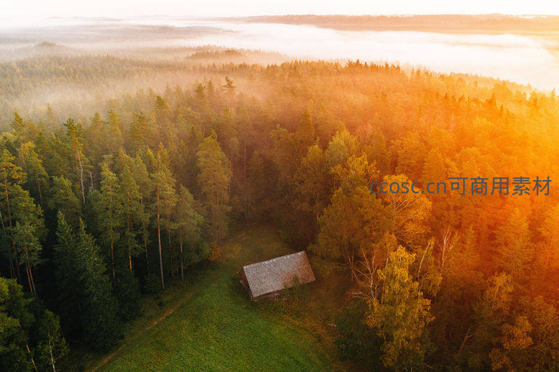 航拍晨雾笼罩林中小屋如画