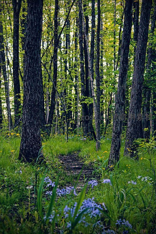 春日森林中一条泥土小径穿行于高大树木之间,两旁紫色野花竞相开放,绿意盎然,洋溢着勃勃生机。