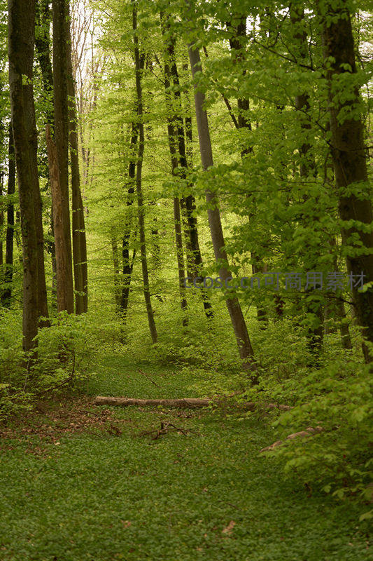 茂密的森林中,一条蜿蜒的小径穿过绿意盎然的植被,高大的树木挺拔而立,阳光透过叶隙洒下斑驳光影,营造出宁静祥和的氛围。