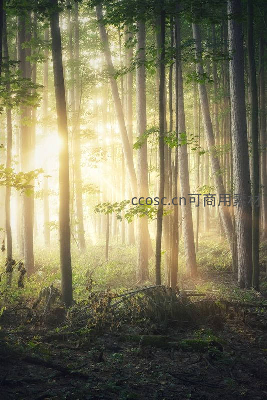 清晨的阳光斜射进密林,形成道道金色光束,穿透树冠照亮林地,落叶与苔藓在光影中更显层次,整个森林沐浴在温暖而神秘的光辉之中。