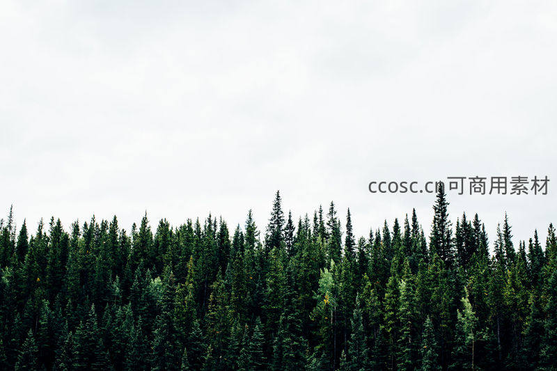 灰白色的天空下,一片浓密的针叶林如绿色海洋般延展至远方,整齐的树梢构成一道天然的边界线,传递出苍茫而宁静的自然力量。