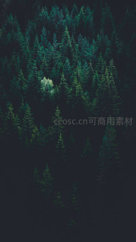 从高空俯瞰茂密森林,深绿针叶林层层叠叠,中央一抹浅色树冠如画龙点睛,展现大自然原始而静谧的壮美。