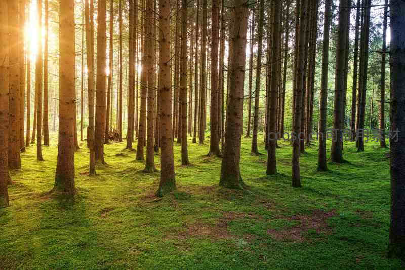 暖阳斜照在排列整齐的松树林中,地面覆盖着鲜绿苔藓,光影交错间尽显自然和谐之美,是放松身心的理想之地。