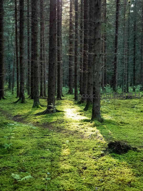 阳光透过树冠缝隙照射在覆盖厚厚青苔的林地,形成明暗对比的小路,充满生机与童话般的清新感。
