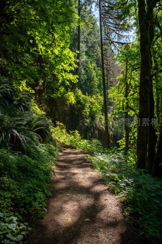 一条泥土小径蜿蜒于茂密森林之中,阳光透过高大树木洒下温暖光束,四周蕨类与灌木丛生,是感受自然气息的理想步道。