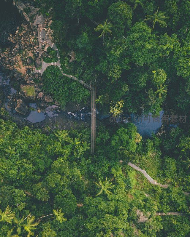 从空中俯视,一座细长的木质栈桥横跨在郁郁葱葱的热带雨林之上,下方溪流潺潺,四周植被繁茂,充满原始生态的探险气息。