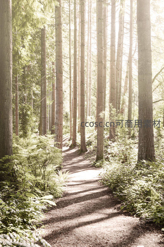 柔和的阳光穿过高大的松树缝隙,在铺满落叶的小径上投下斑驳的光影,营造出静谧、温暖且令人放松的林间漫步氛围。