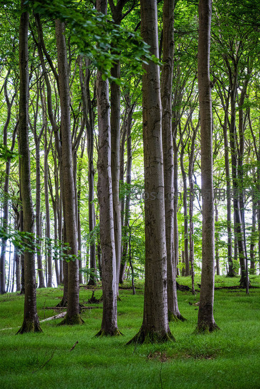 高大笔直的树木在翠绿草地上整齐排列,阳光从叶隙间洒落,形成明暗交错的视觉效果。整个画面充满生命力与自然的清新气息。