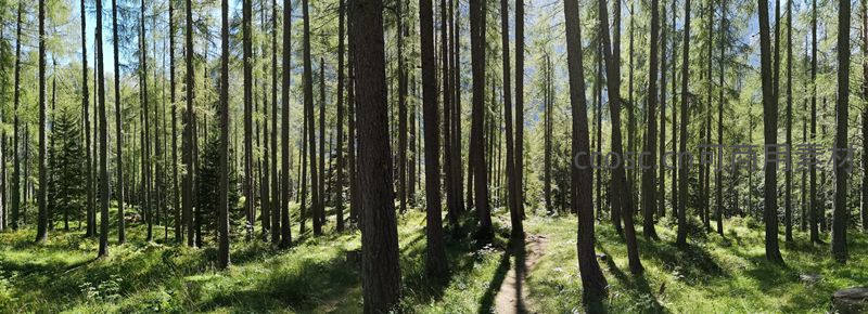 一条蜿蜒小径穿过茂密松林,阳光透过枝叶在地面投下斑驳光影。绿草如茵,空气清新,是理想的徒步与放松身心的自然场所。