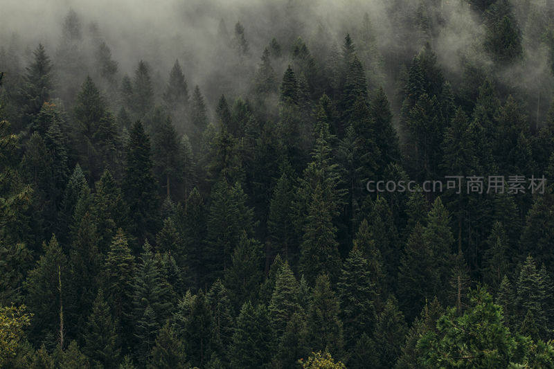 从高空俯瞰,浓雾轻柔地覆盖在连绵的针叶林上,深绿的树冠若隐若现,营造出神秘而宁静的氛围,宛如大地的绿色绒毯。