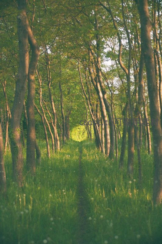 阳光斜照下,一条被绿草覆盖的小径蜿蜒穿过林间,两侧树木挺拔,尽头透出明亮的光晕,仿佛通往童话世界的宁静秘境。