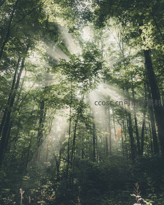 清晨的阳光穿透茂密的树冠,形成道道光束洒向林间,为幽深的森林增添了一抹神圣而梦幻的色彩。