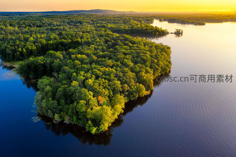 夕阳西下,金色光辉洒满湖面与岸边茂密森林,半岛轮廓清晰倒映水中,天地一色,尽显大自然的静谧与壮美。