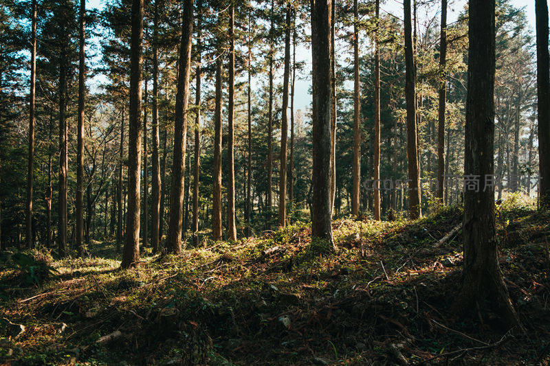 高大笔直的树木排列整齐,阳光穿过枝叶在地面投下斑驳光影,落叶与苔藓覆盖林地,营造出安详沉静、适合冥想与漫步的午后氛围。