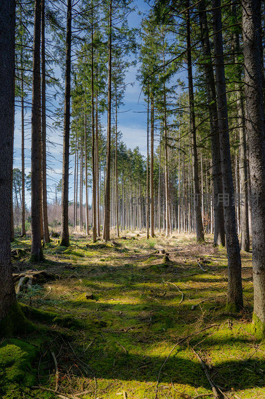 明媚阳光穿透整齐排列的松树林,在铺满青苔的地面上投下斑驳光影,远处蓝天白云,空气清新,令人心旷神怡。