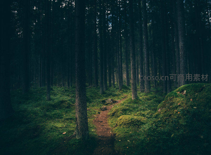高大笔直的树木形成天然拱廊,脚下覆盖着厚厚的苔藓,一条泥土小径延伸进幽暗深处,静谧而神秘。