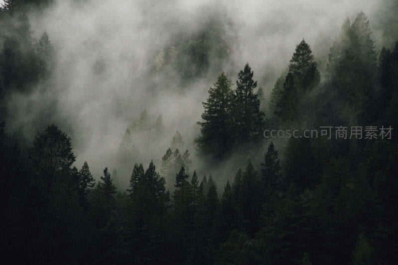 厚重雾霭弥漫于茂密针叶林间,树木轮廓在灰白雾中若隐若现,营造出神秘而沉静的氛围,仿佛通向未知秘境。