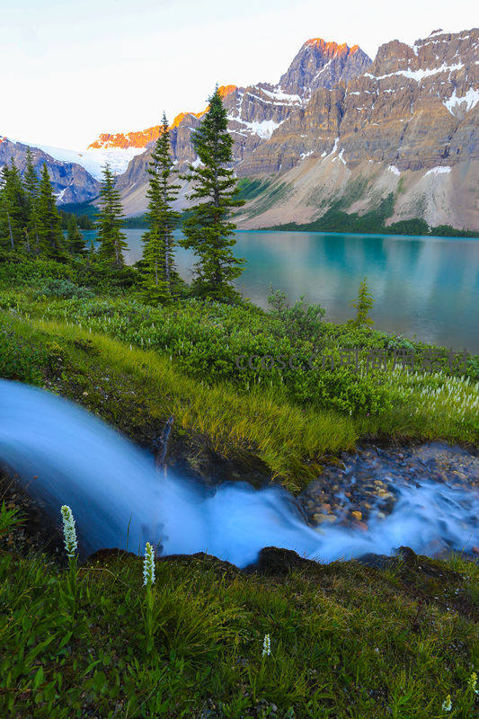 夕阳为雪峰镀上金边,碧蓝湖水倒映天光,前景小溪如丝绸般流淌,野花点缀绿草,尽显高山仙境之美。