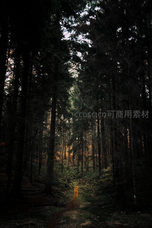 浓密的树林深处几乎一片漆黑,仅有一束温暖的光线穿透树冠洒在小径上,营造出神秘而引人探索的氛围。
