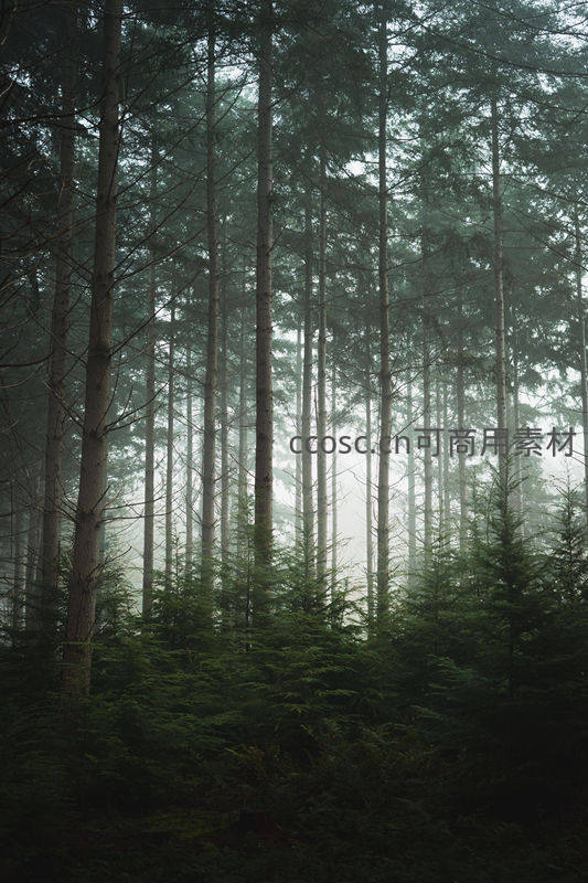 浓重的雾气弥漫在古老森林之中,高大树木的轮廓在白雾中若隐若现,营造出如梦似幻的仙境氛围,仿佛置身于童话故事的深处。