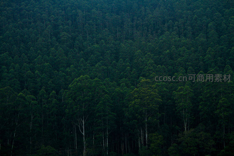 浓密的深绿色树林覆盖山坡,光影交错间透出静谧与神秘,仿佛置身于未被打扰的原始森林深处,感受自然的沉稳与力量。