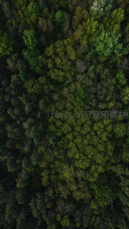 从高空垂直向下拍摄,密集树冠形成复杂而和谐的纹理图案,深浅不一的绿色交织,展现森林生态系统的丰富层次与秩序感。