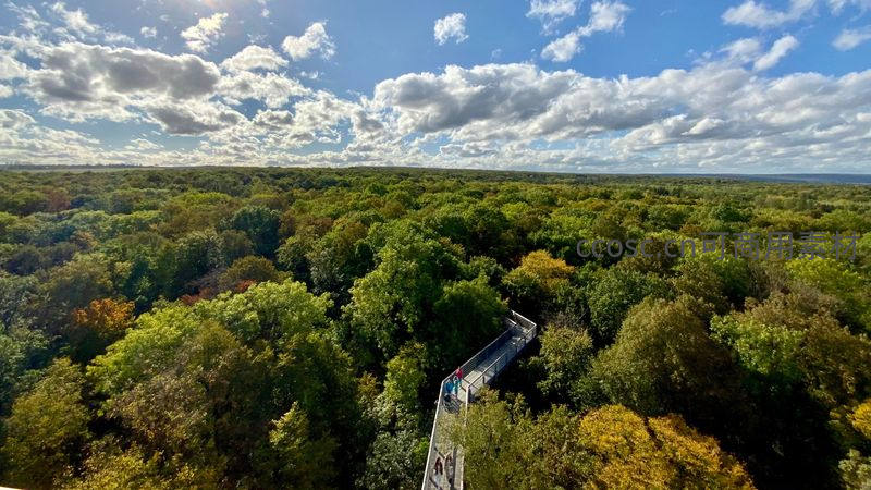 高耸的观景台延伸至茂密树冠之上,游客在此俯瞰一望无际的绿色森林,头顶是点缀着朵朵白云的湛蓝天空。